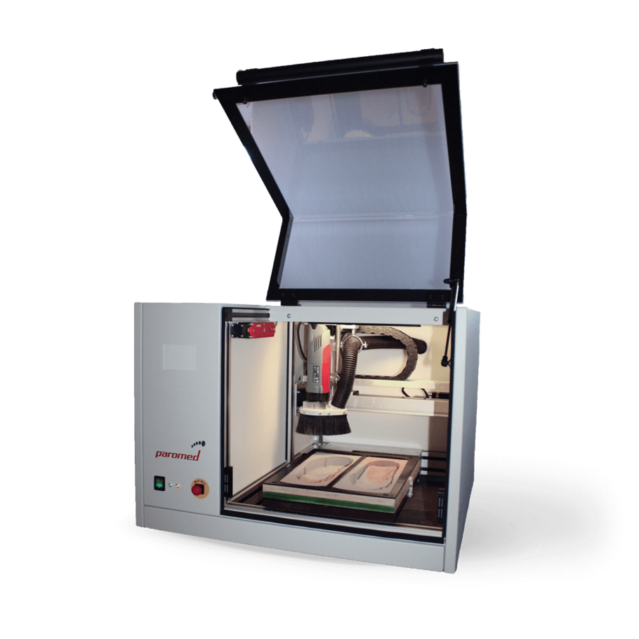 - Verfügt über die Modellier- und Bearbeitungsmöglichkeiten der paroContour S1 (Einarbeiten von Weichpolstern, mehrfaches Überfräsen mit verschiedenen Materialien etc.)